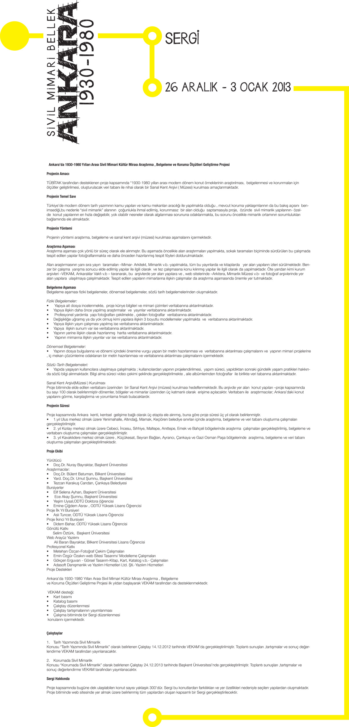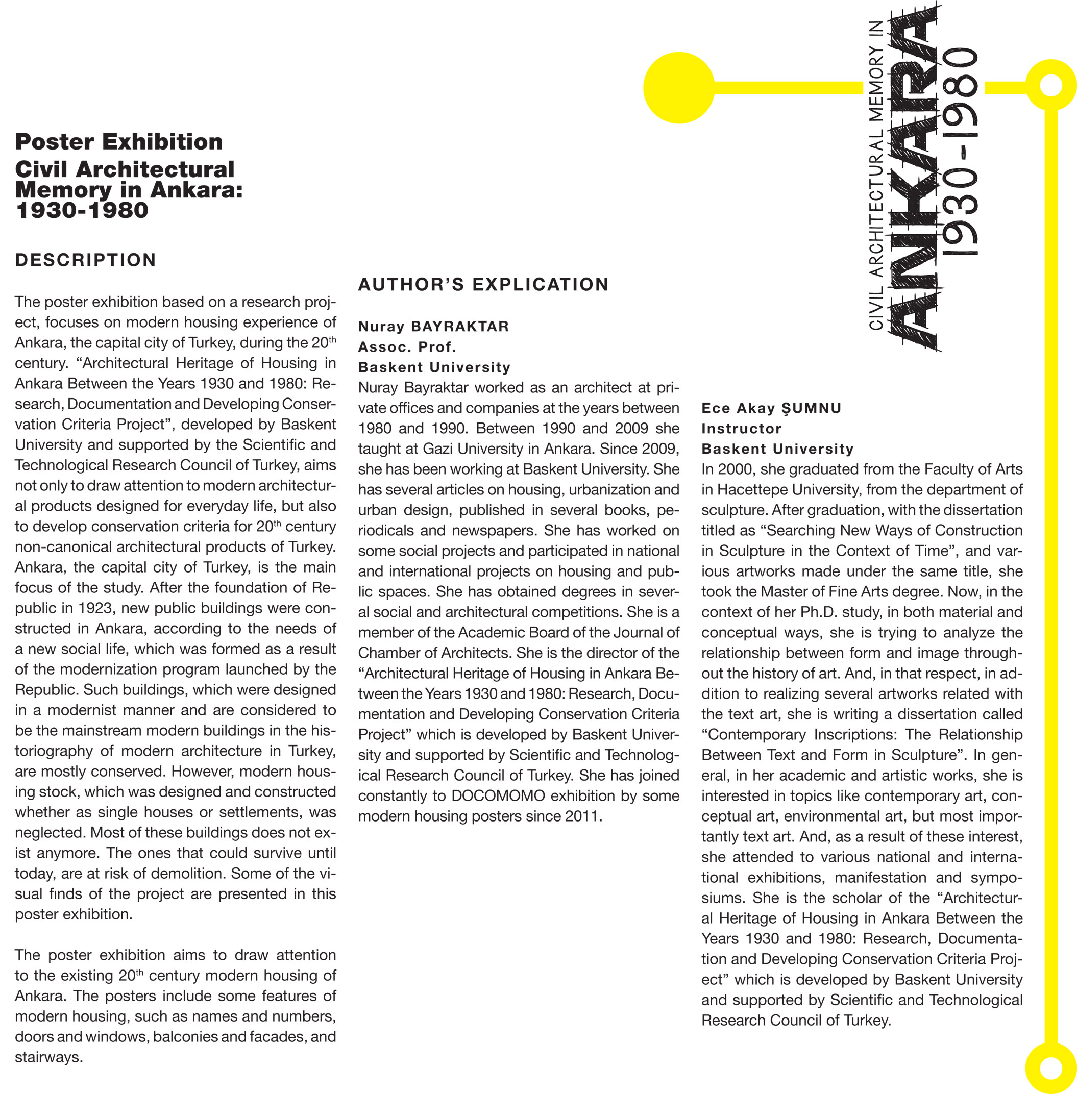 Sivil Mimari Bellek Ankara 1930-1980VEKAM desteğiyle gerçekleştirilen Sivil Mimari Bellek Ankara 1930-1980 Sergisi yapıldıkları dönemin barınma pratiklerini ve modern yaşam kültürünü aktaran bu yapılar arasından belirlenmiş 120 yapıya ilişkin olarak düzenlenmiştir. Sergide yer alan posterler aracılığı ile bu yapılara dikkat çekilmesi ve bu yapıların mimarlarının bilinir olmasının sağlanması; öte yandan kullanıcılara ait sesli sunumlar aracılığı ile bu yapıların sosyal olarak yeniden üretilmeleri sürecinin ortaya konulması amaçlanmıştır.